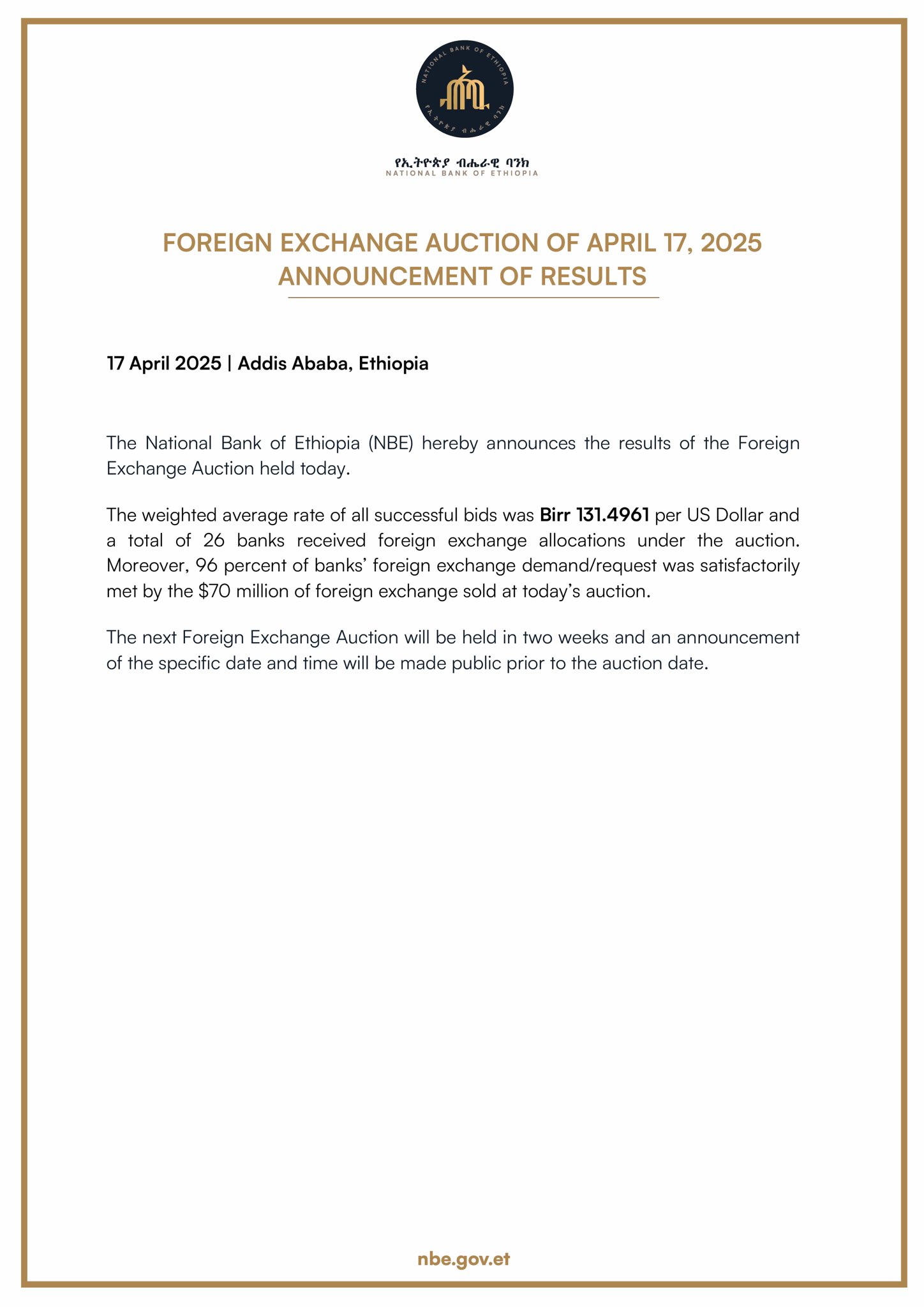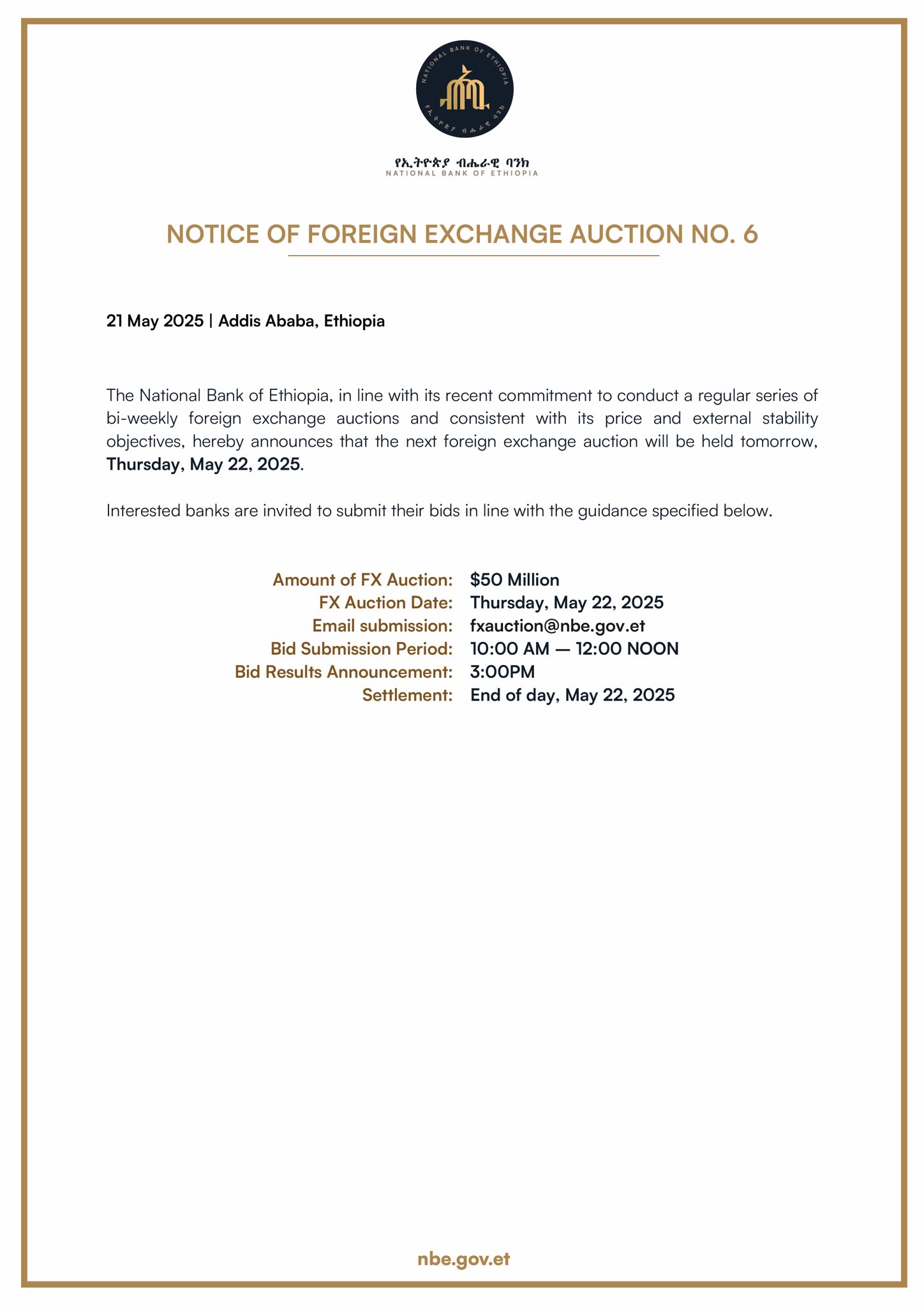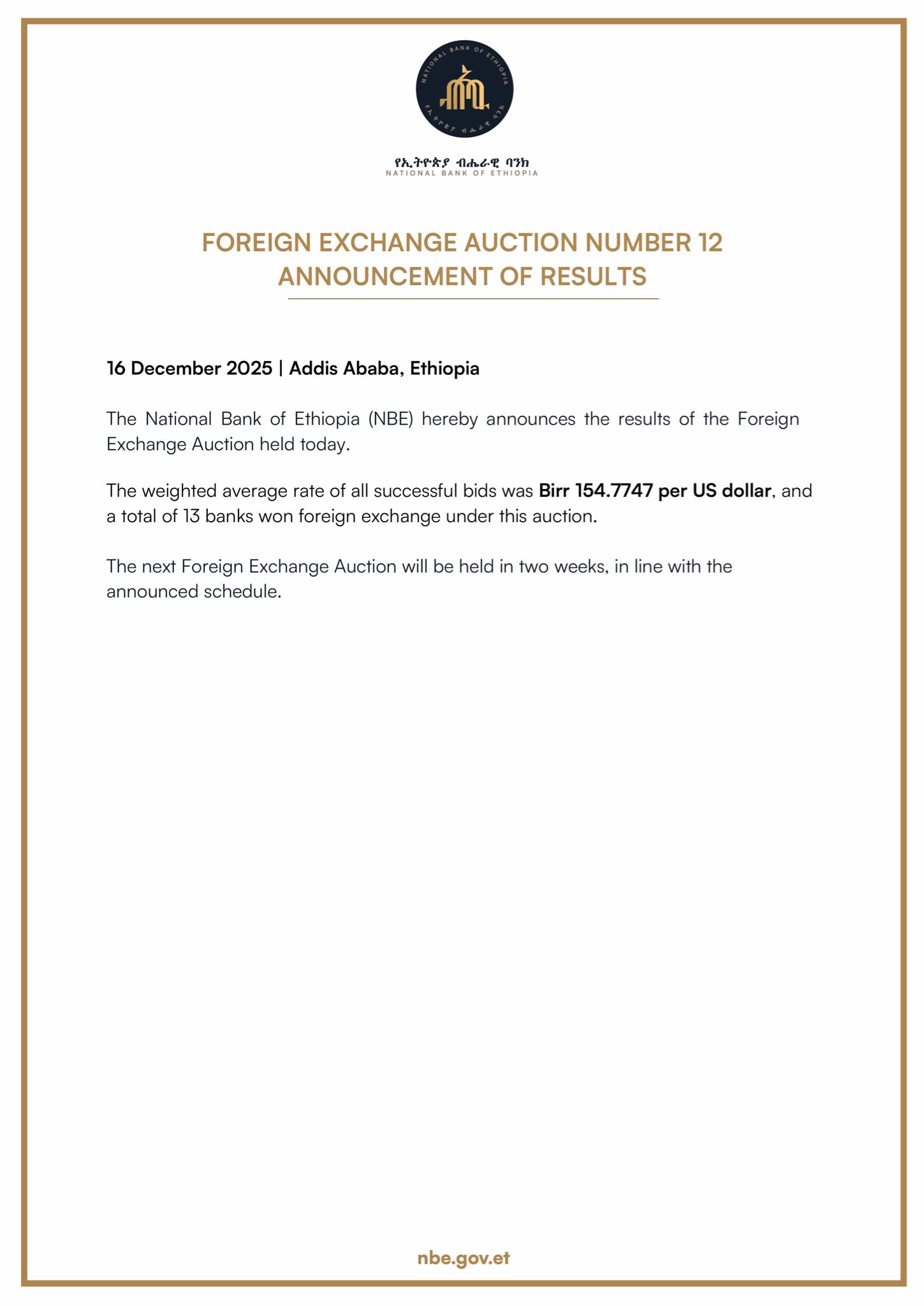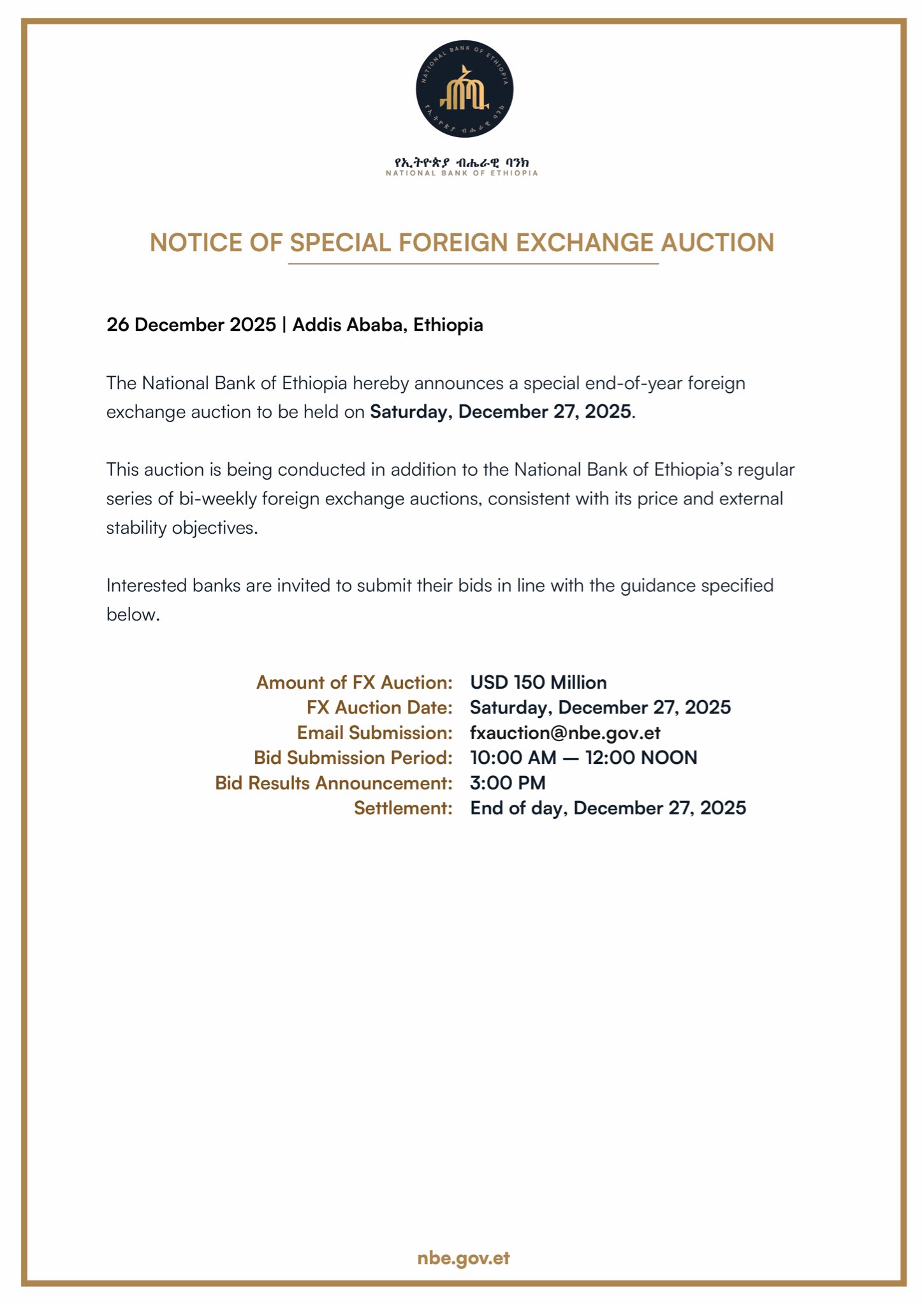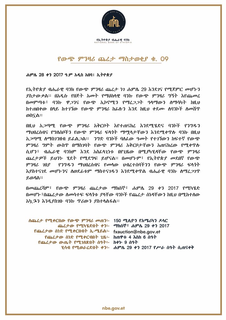 The National Bank of Ethiopia hereby announces that it will be starting a regular series of foreign exchange auctions to be held every two weeks. The auctions will be conducted over a period of several months and are intended to ensure continued stability in Ethiopia’s foreign exchange market.