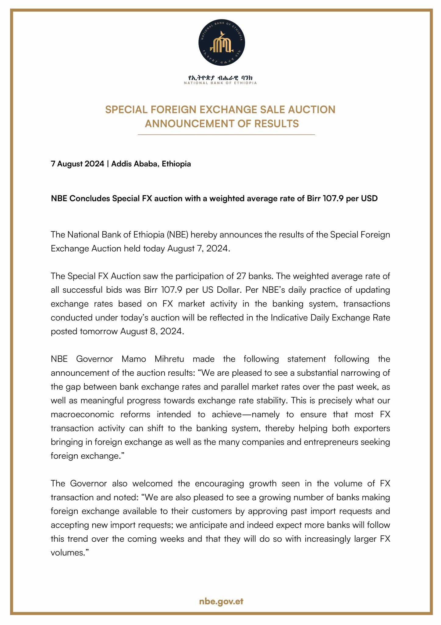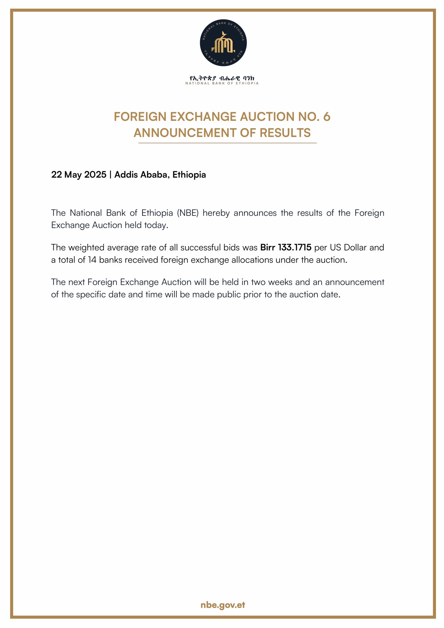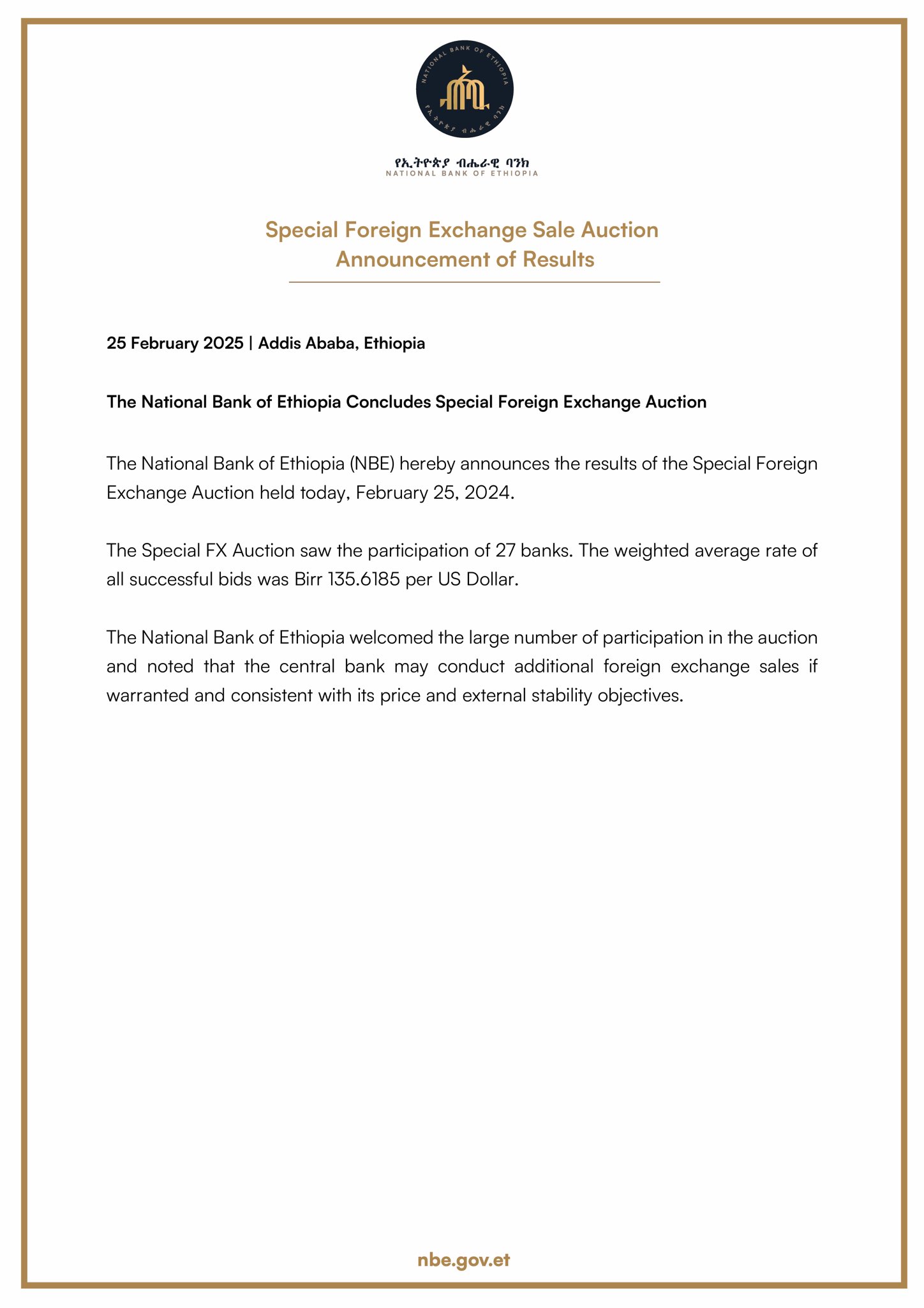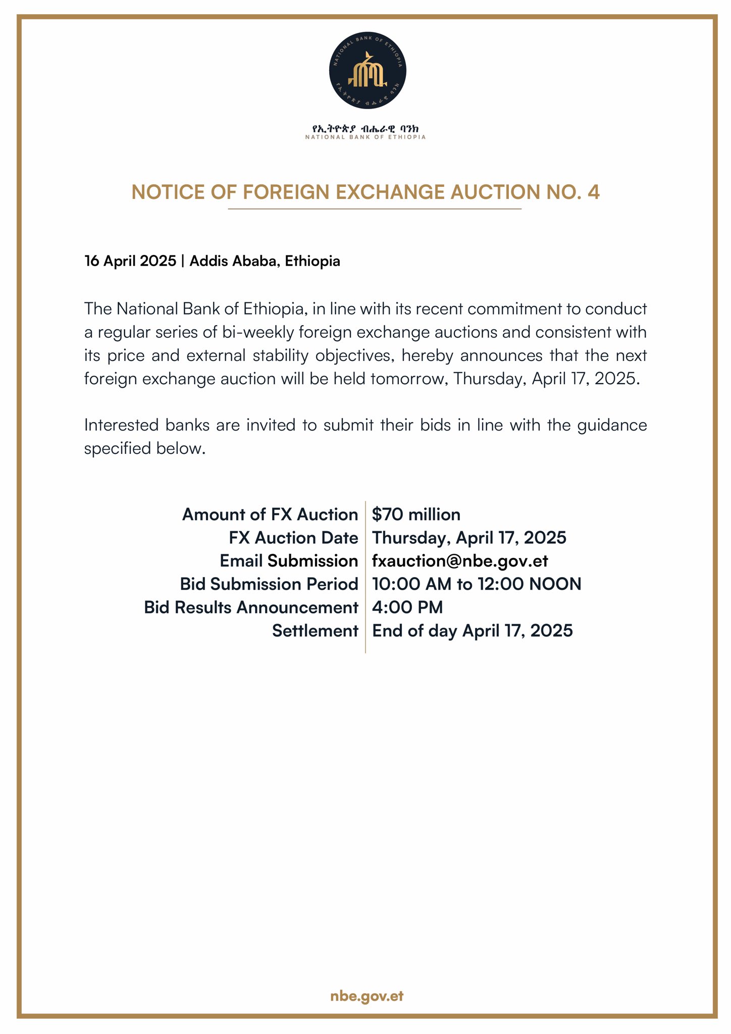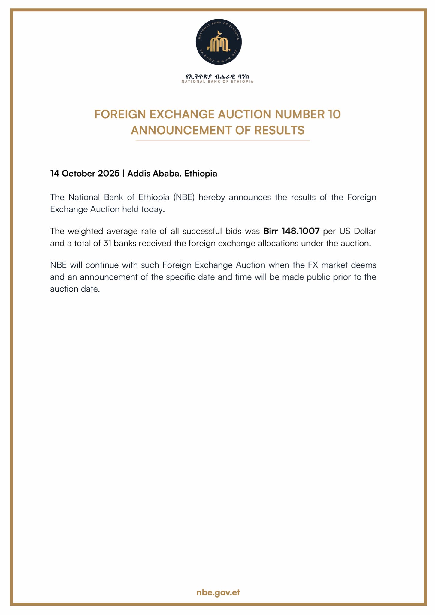 The National Bank of Ethiopia hereby announces that it will be starting a regular series of foreign exchange auctions to be held every two weeks. The auctions will be conducted over a period of several months and are intended to ensure continued stability in Ethiopia’s foreign exchange market.
