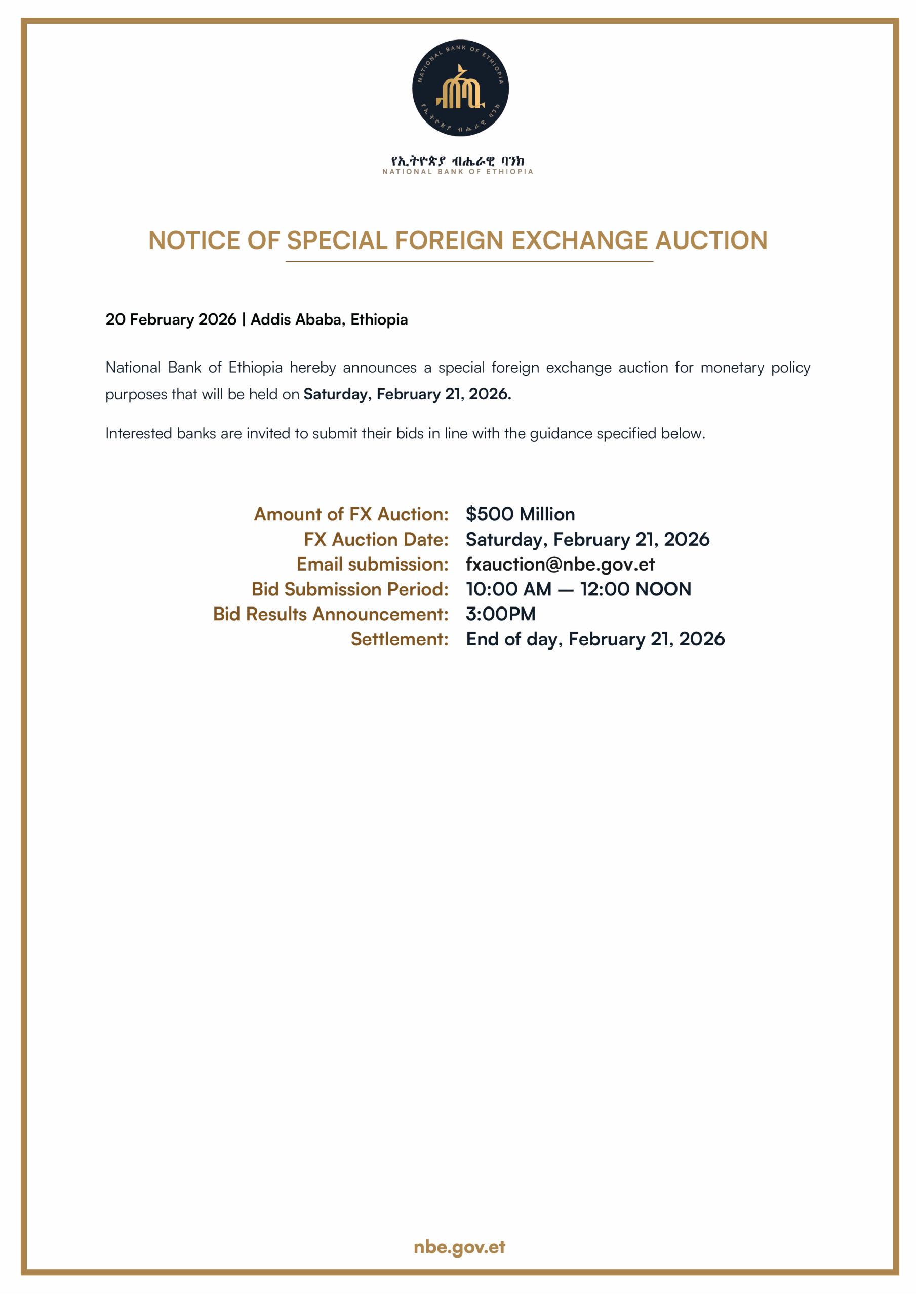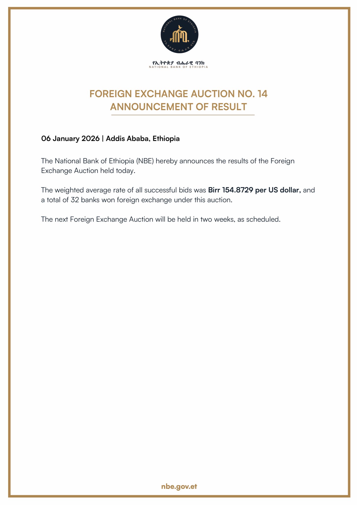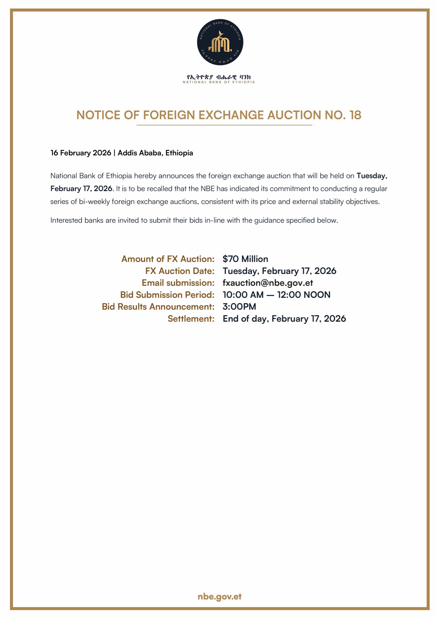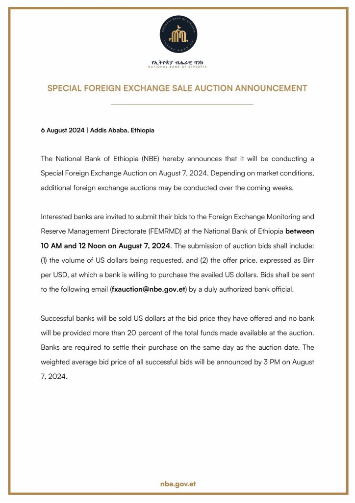 The National Bank of Ethiopia hereby announces that it will be starting a regular series of foreign exchange auctions to be held every two weeks. The auctions will be conducted over a period of several months and are intended to ensure continued stability in Ethiopia’s foreign exchange market.