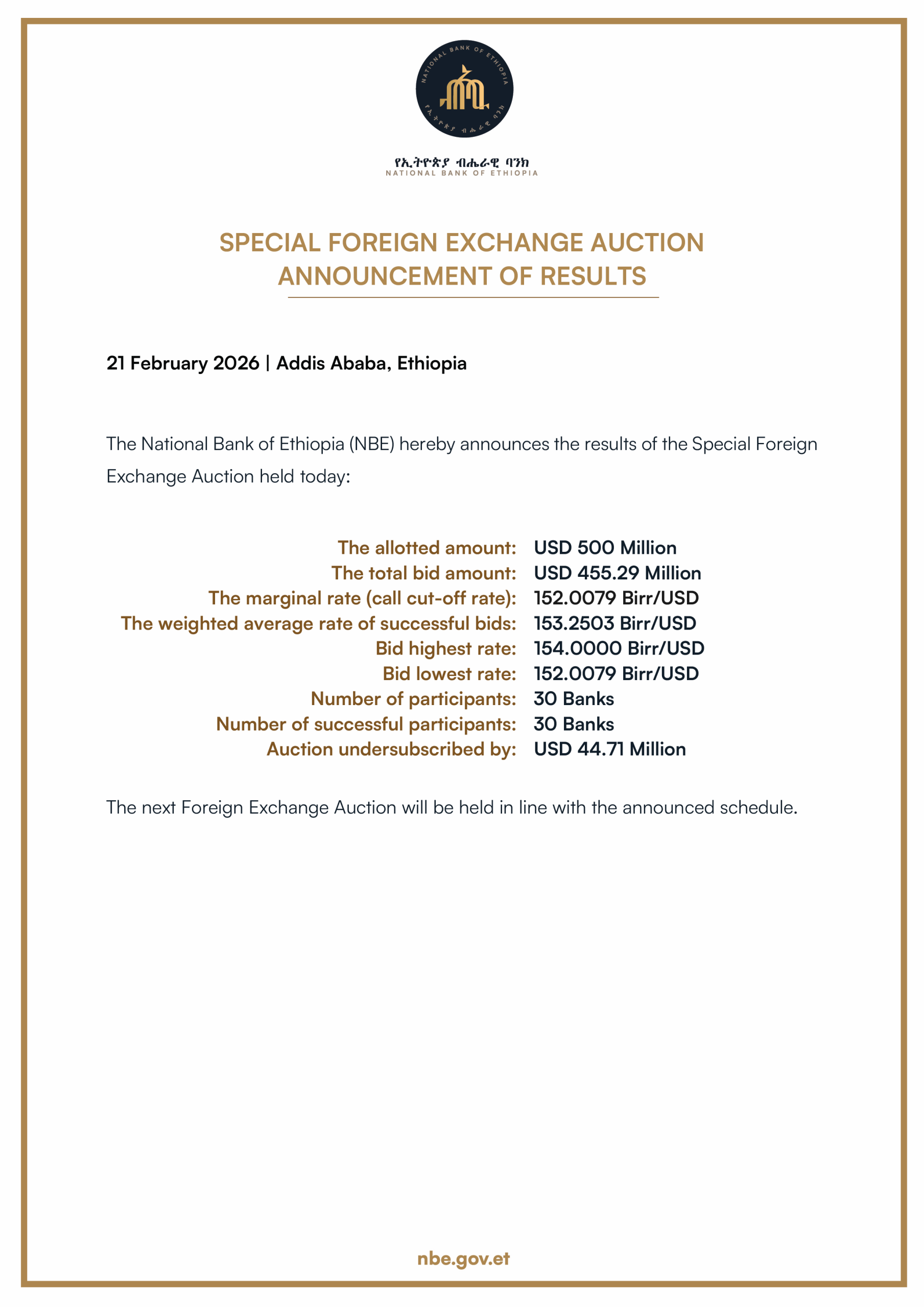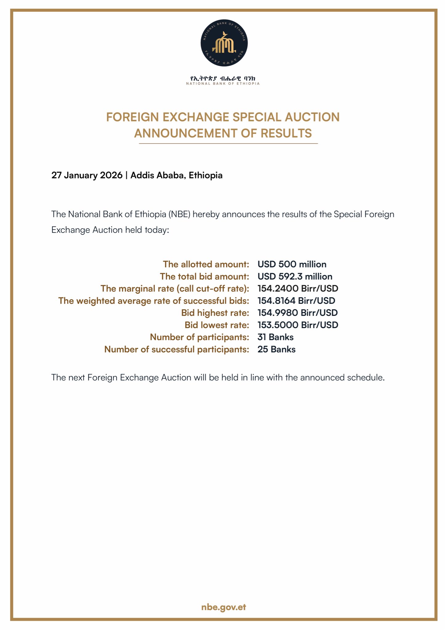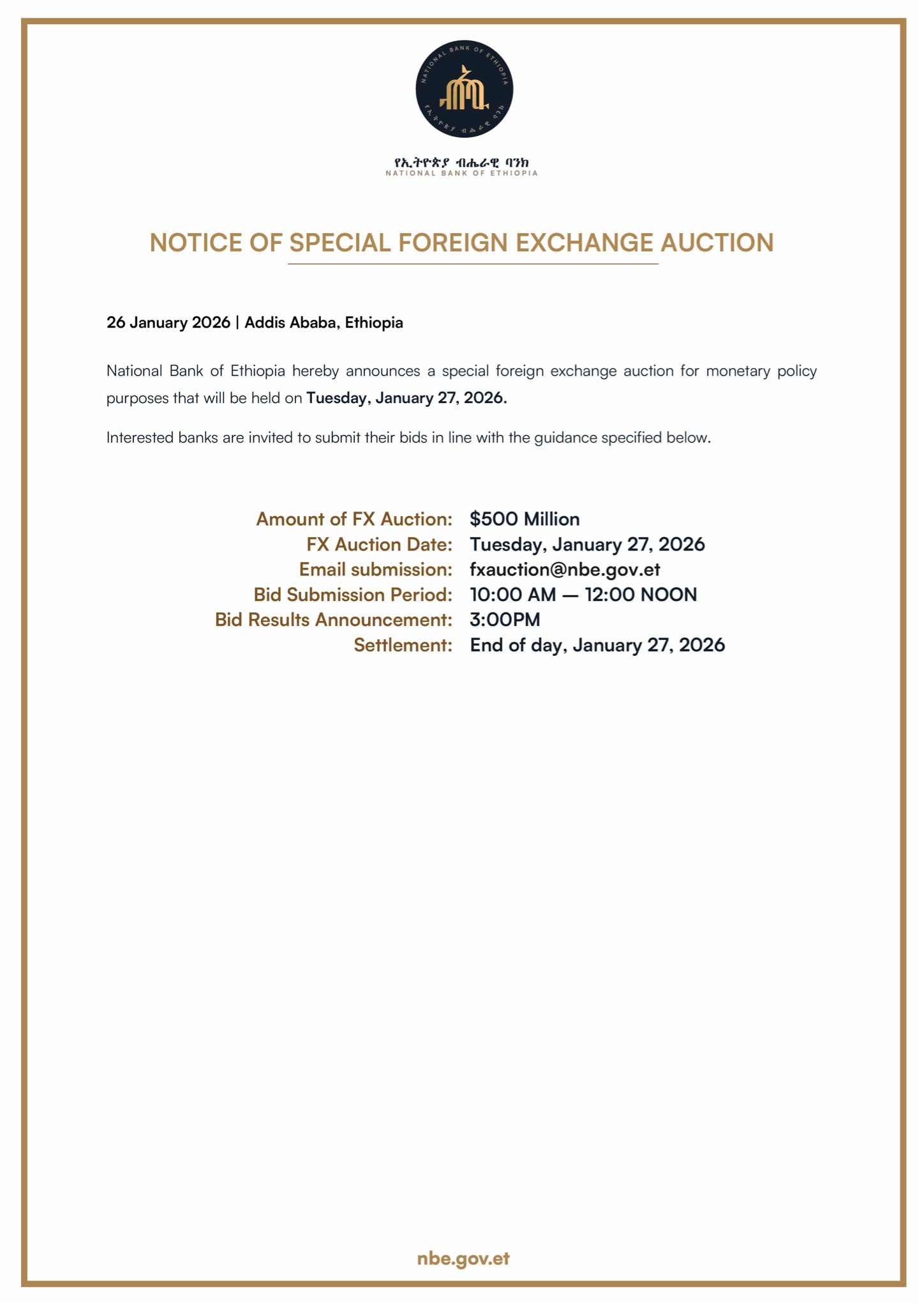 The National Bank of Ethiopia hereby announces that it will be starting a regular series of foreign exchange auctions to be held every two weeks. The auctions will be conducted over a period of several months and are intended to ensure continued stability in Ethiopia’s foreign exchange market.